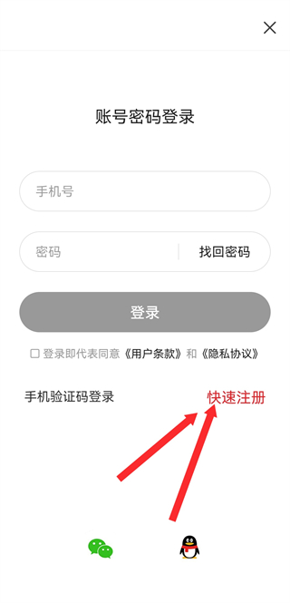 3、在進入到登錄的界面后,點擊快速注冊,進入注冊的頁面。