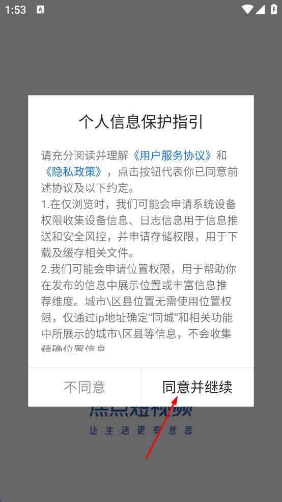 1、打開點(diǎn)點(diǎn)短視頻,會彈出個(gè)人信息保護(hù)指引,仔細(xì)閱讀相關(guān)內(nèi)容后,點(diǎn)擊“同意并繼續(xù)”按鈕,進(jìn)入軟件主界面。