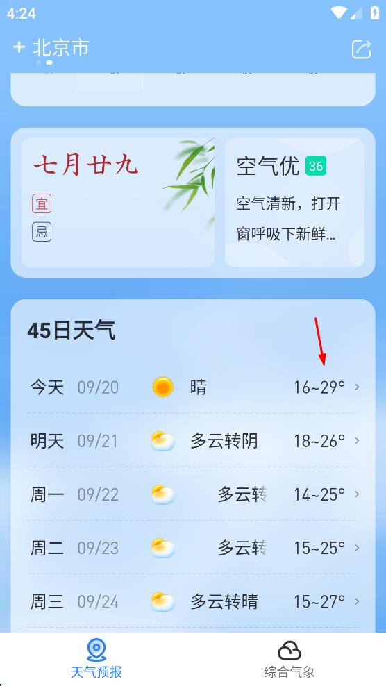 3、在北京市天氣頁面,找到“45日天氣”板塊,點(diǎn)擊當(dāng)天天氣欄(如顯示“今天 09/20 晴 16~29°”的欄),進(jìn)入更詳細(xì)的天氣信息頁面。