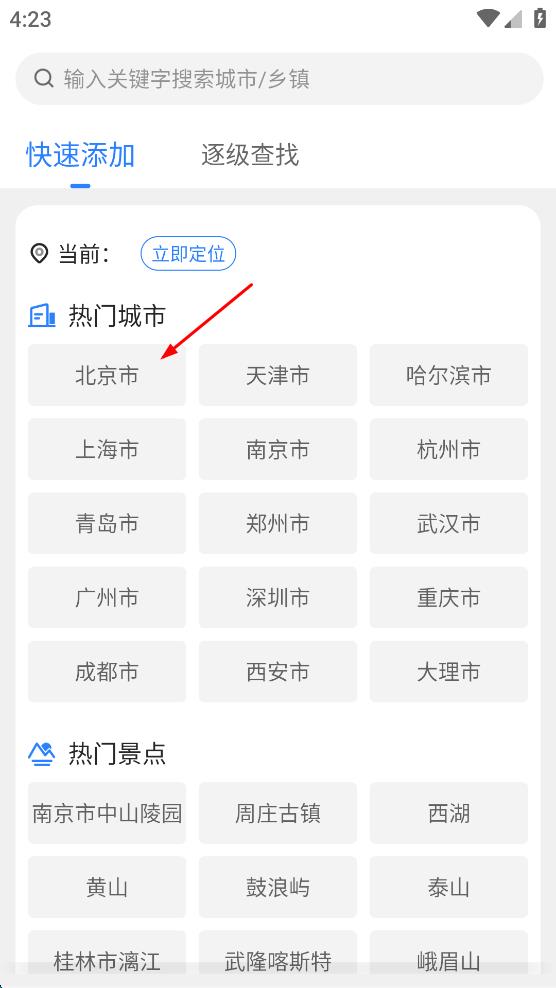 2、在城市選擇頁面,可通過“快速添加”下的熱門城市選擇,比如點(diǎn)擊“北京市”,進(jìn)入北京市天氣頁面。