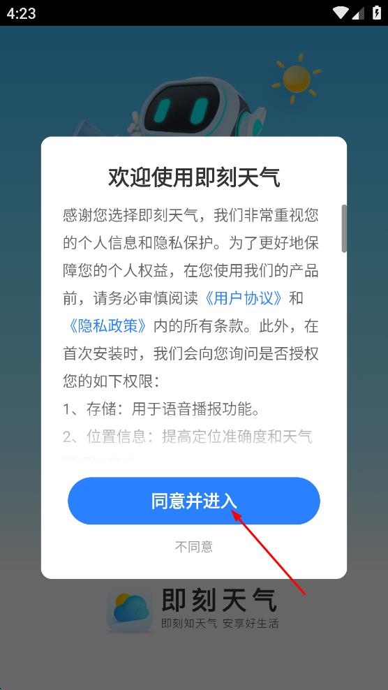 1、打開即刻天氣APP,在彈出的“歡迎使用即刻天氣”提示框中,點(diǎn)擊“同意并進(jìn)入”按鈕,進(jìn)入城市選擇頁面。