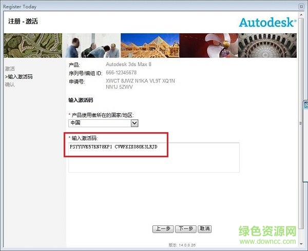 9.將激活碼“PSYYUVK57KN78KP1 CVWFXZX080K3LRJD”復制到輸入激活碼框中,點擊“下一步”地區(qū)選“中國”