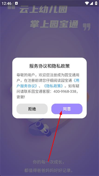 1、打開園寶通app,在彈出的隱私政策窗口中,點擊同意按鈕。