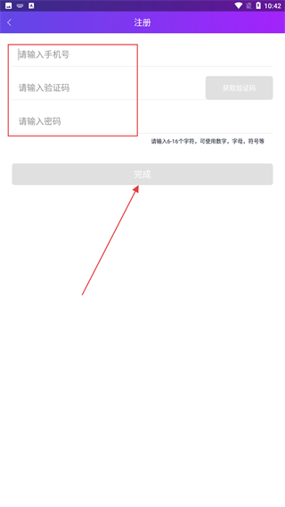 4、在注冊界面內(nèi),輸入手機號、驗證碼以及密碼再點擊完成。