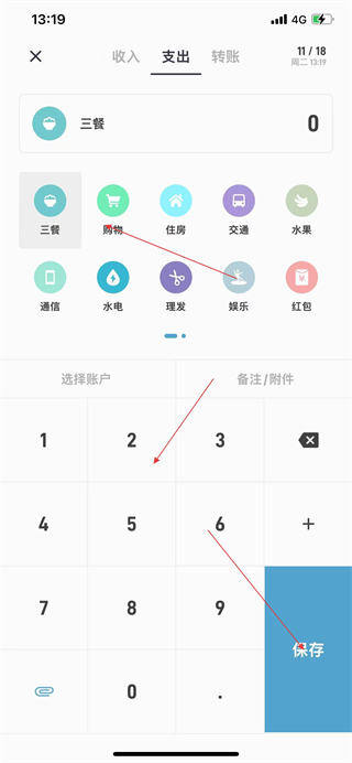 2、在記賬頁面選擇支出類型,輸入支出金額,點(diǎn)擊保存。