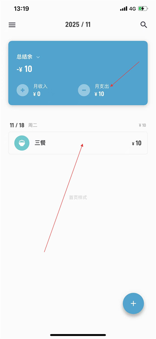 3、保存后,在首頁即可查看本月的支出記錄和總結(jié)余情況。