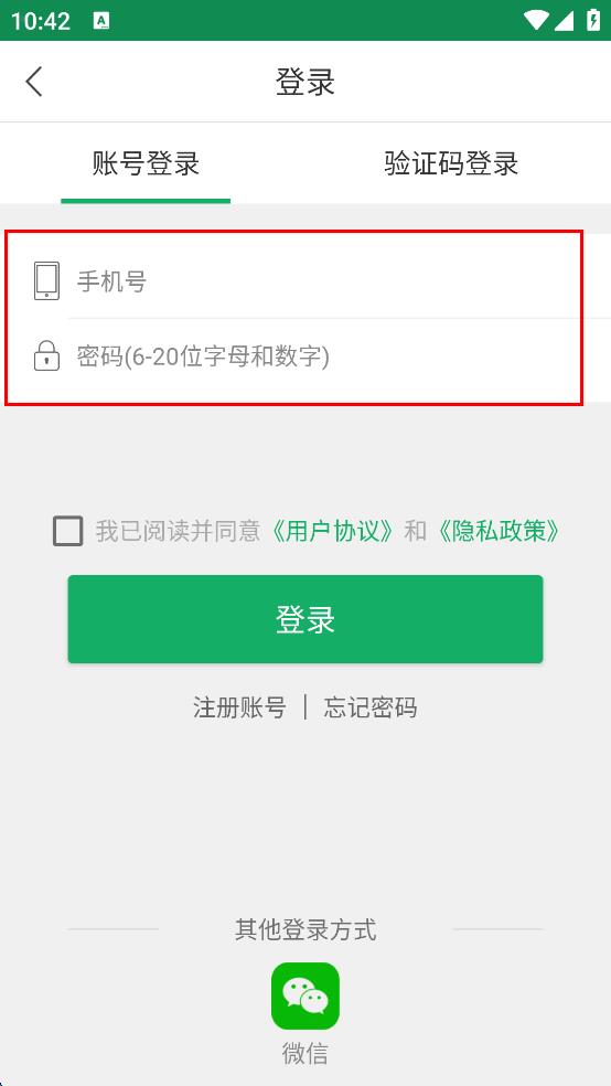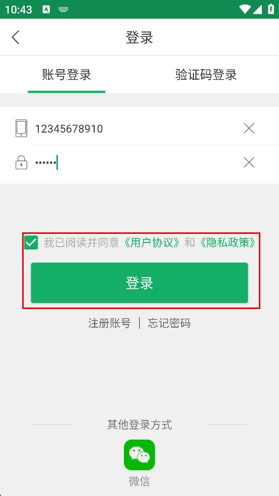 3、在登錄界面的“賬號登錄”選項下,依次在手機號和密碼輸入框中,填寫好手機號和密碼。