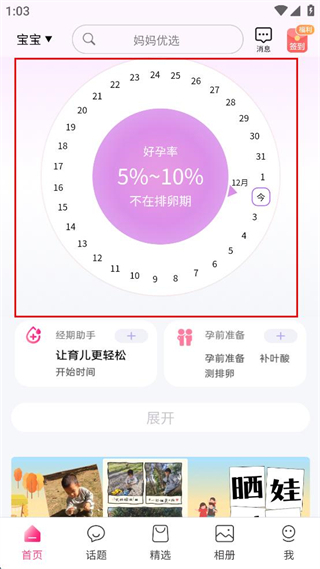 4、完成生日選擇后進(jìn)入軟件首頁(yè),可查看好孕率等相關(guān)信息,完成初始設(shè)置流程。