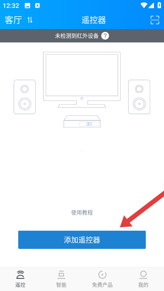 1、打開遙控精靈APP,進入遙控器頁面后,點擊添加遙控器按鈕,啟動設備匹配的流程。