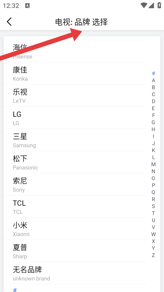 3、在電視品牌選擇的頁面,找到并點擊自家電視對應的品牌如海信、小米、索尼等,按提示完成遙控器配對操作。