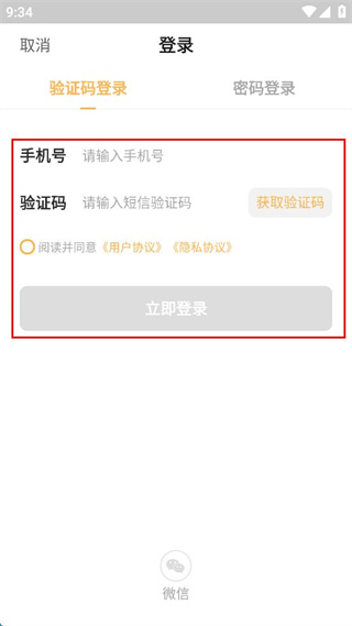 4、在登錄界面選擇驗(yàn)證碼登錄,填寫手機(jī)號和驗(yàn)證碼并勾選協(xié)議,點(diǎn)擊立即登錄。