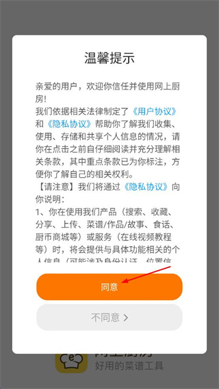 1、在軟件彈出的溫馨提示界面,點(diǎn)擊橙色的同意按鈕,進(jìn)入主界面。
