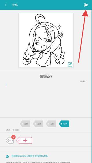 3、進(jìn)入作品投稿頁面,填寫作品標(biāo)題,添加至少一個(gè)標(biāo)簽,確認(rèn)信息無誤后,點(diǎn)擊頁面右上角的發(fā)送,即可完成作品發(fā)布。
