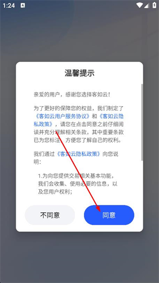 1、打開掌上客如云,在彈出的溫馨提示界面,點(diǎn)擊同意。