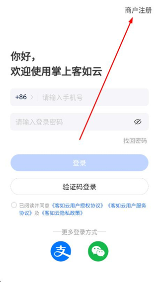 2、進(jìn)入登錄界面后,找到并點(diǎn)擊右上角的商戶注冊選項(xiàng)。