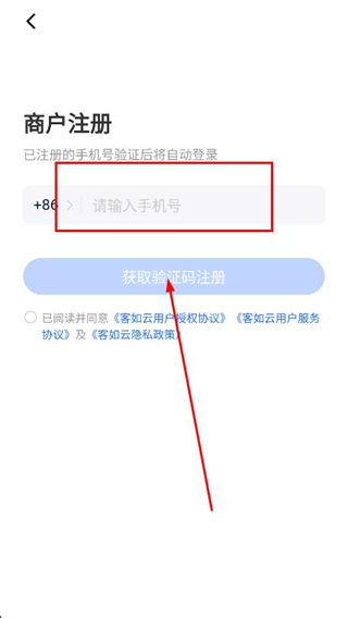 3、在商戶注冊頁面,輸入手機(jī)號碼,點(diǎn)擊獲取驗(yàn)證碼注冊。