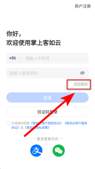 1、打開掌上客如云APP,在登錄界面點(diǎn)擊找回密碼。