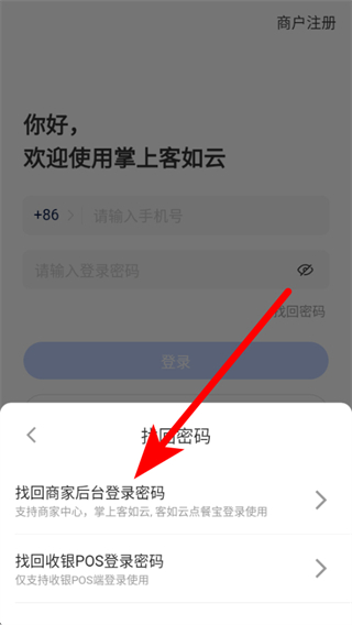 2、我們需要選擇要找回的密碼類型,如找回商家后臺登錄密碼。