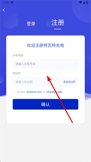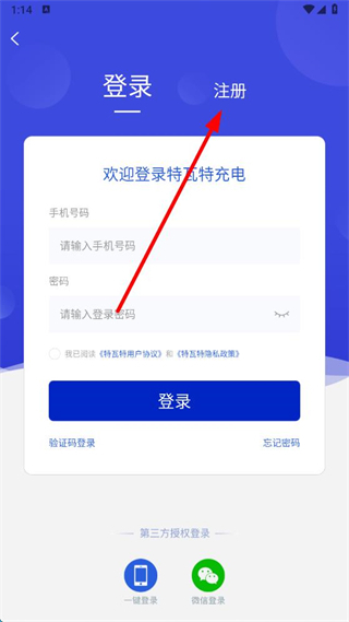 1、在特瓦特充電首頁,點擊右下角我的按鈕,進入登錄注冊界面。