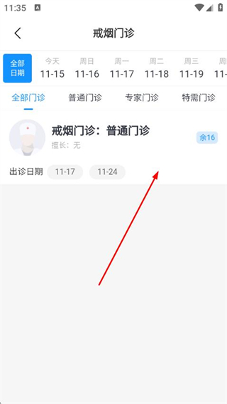 4、在門診選擇頁面選擇就診日期和具體門診類型,進(jìn)入醫(yī)生排班頁面。