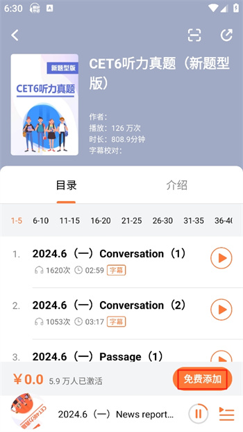 2、右下角綜合這里有一個【免費(fèi)添加】的按鍵,將這個資源給添加到自己所激活的英語資源中,進(jìn)行下一步的音頻激活;