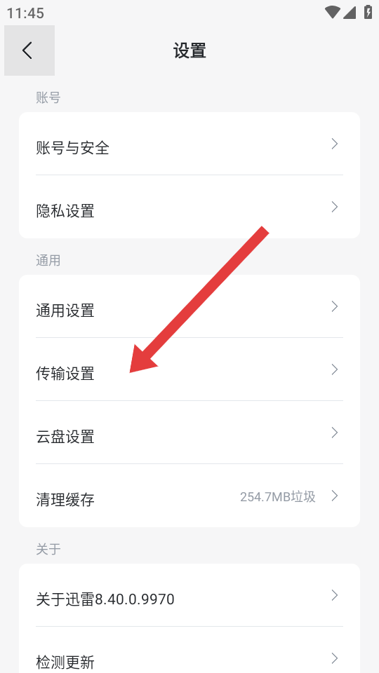 1、打開迅雷APP,進(jìn)入設(shè)置的頁面,點(diǎn)擊傳輸設(shè)置的選項,進(jìn)入傳輸設(shè)置界面。