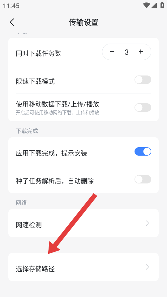2、在傳輸設(shè)置頁面中,點(diǎn)擊選擇存儲路徑的選項,跳轉(zhuǎn)至存儲路徑選擇頁面。
