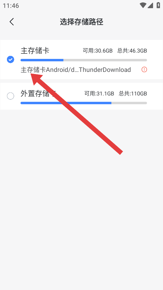 3、在選擇存儲路徑頁面,勾選主存儲卡或外置存儲,根據(jù)自己的需求選擇,即可修改下載文件的存儲路徑。