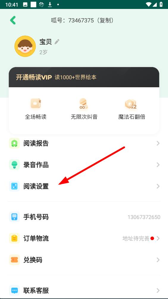 1、打開呱呱閱讀app,進(jìn)入家長(zhǎng)中心后,找到閱讀設(shè)置選項(xiàng)并點(diǎn)擊進(jìn)入。