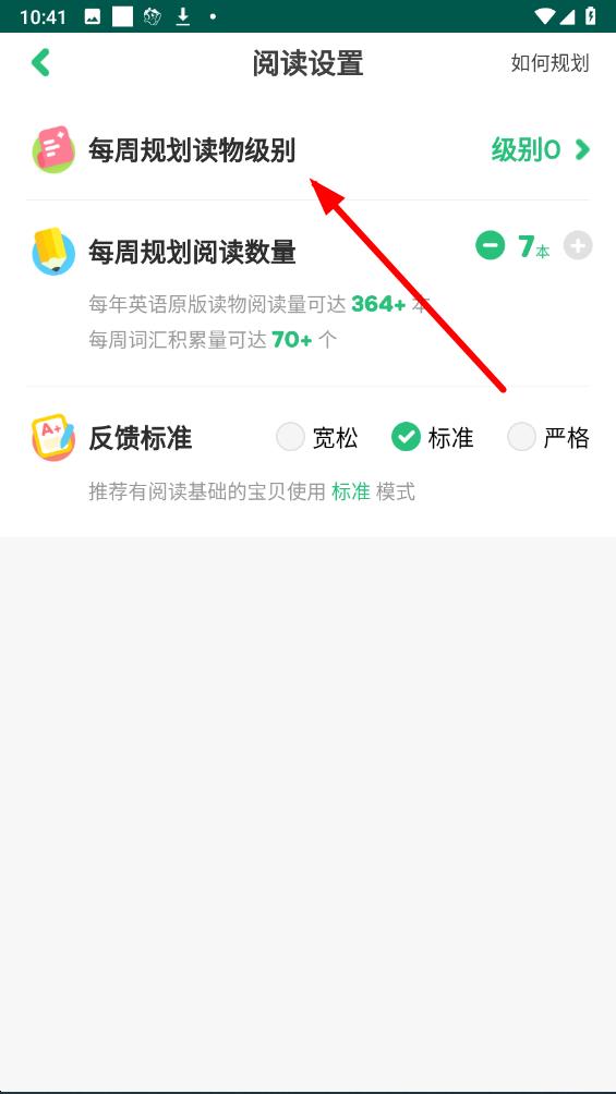 2、進(jìn)入頁面后,點(diǎn)擊每周規(guī)劃讀物級(jí)別選項(xiàng),能看到當(dāng)前的讀物級(jí)別,根據(jù)孩子的閱讀能力和水平,可進(jìn)一步調(diào)整閱讀級(jí)別。
