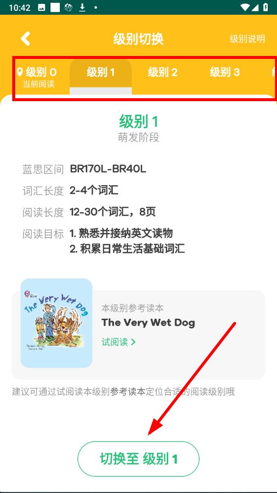 3、選擇想要切換的讀物級(jí)別,在了解該級(jí)別的藍(lán)思區(qū)間、詞匯長(zhǎng)度等信息后,點(diǎn)擊切換至級(jí)別按鈕,就能完成閱讀級(jí)別的調(diào)整,實(shí)現(xiàn)智能閱讀規(guī)劃。