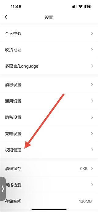 3、在設(shè)置界面,點(diǎn)擊權(quán)限管理選項(xiàng),進(jìn)入權(quán)限管理列表頁面。