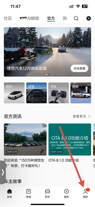 1、打開理想汽車app,進(jìn)入首頁后點(diǎn)擊底部我的選項(xiàng)。