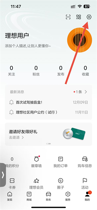 1、打開理想汽車app,在我的頁面點(diǎn)擊右上角設(shè)置圖標(biāo),進(jìn)入設(shè)置頁面。