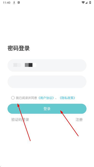 3、注冊(cè)完成后,重新回到密碼登錄頁面,系統(tǒng)自動(dòng)輸入手機(jī)號(hào)碼和密碼,勾選用戶協(xié)議后,點(diǎn)擊登錄。