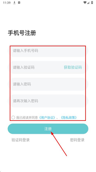 2、輸入手機(jī)號(hào)碼,點(diǎn)擊獲取驗(yàn)證碼并填入,設(shè)置密碼并再次輸入確認(rèn),勾選用戶協(xié)議后,點(diǎn)擊注冊(cè)。