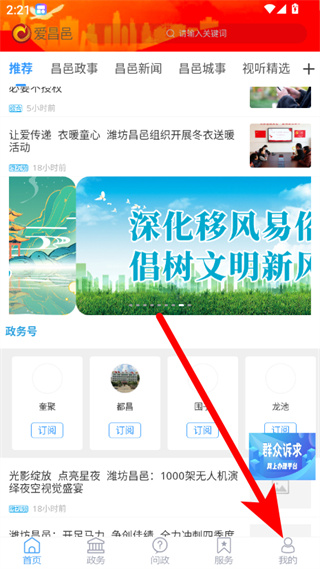 1、在愛昌邑app首頁,點(diǎn)擊右下角我的選項(xiàng),進(jìn)入個人中心頁面。