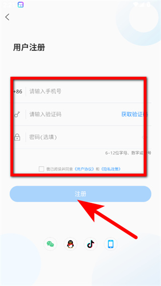 4、填寫手機(jī)號、獲取并輸入驗(yàn)證碼,勾選協(xié)議后點(diǎn)擊注冊,完成賬號注冊。