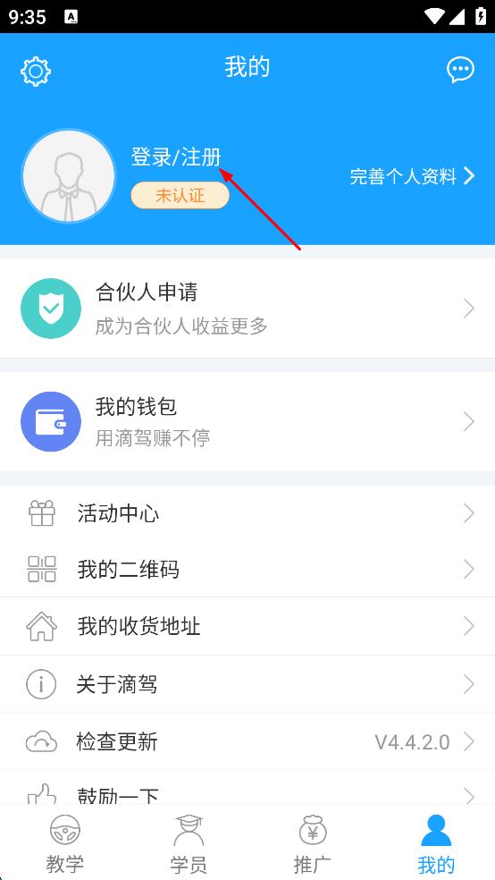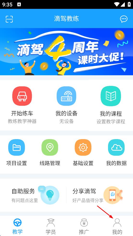 1、打開滴駕教練APP,進(jìn)入主界面后,點(diǎn)擊界面右下角“我的”選項(xiàng),進(jìn)入個(gè)人頁面。