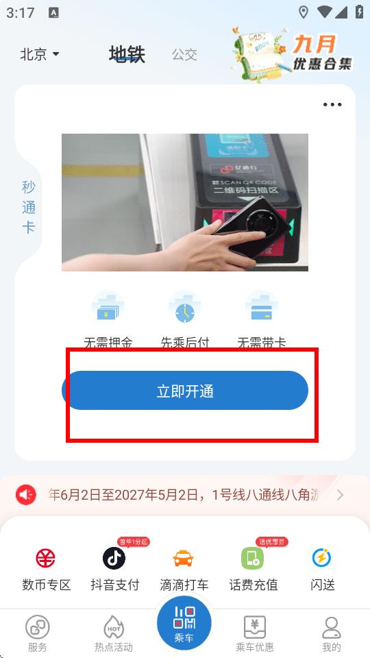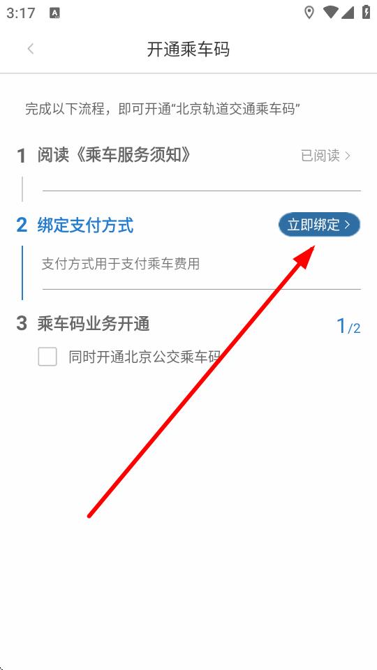 3、進入開通乘車碼界面后,先閱讀乘車服務(wù)須知,閱讀完成后點擊綁定支付方式后的立即綁定。