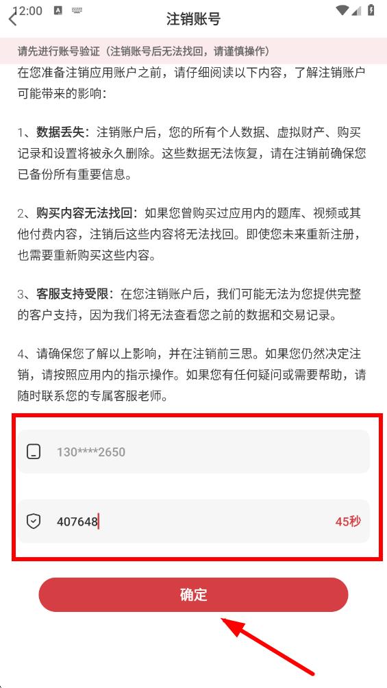 5、隨后按照提示進(jìn)行賬號(hào)驗(yàn)證,輸入手機(jī)號(hào)獲取驗(yàn)證碼并填入,最后點(diǎn)擊確定,即可完成賬號(hào)注銷(xiāo)。