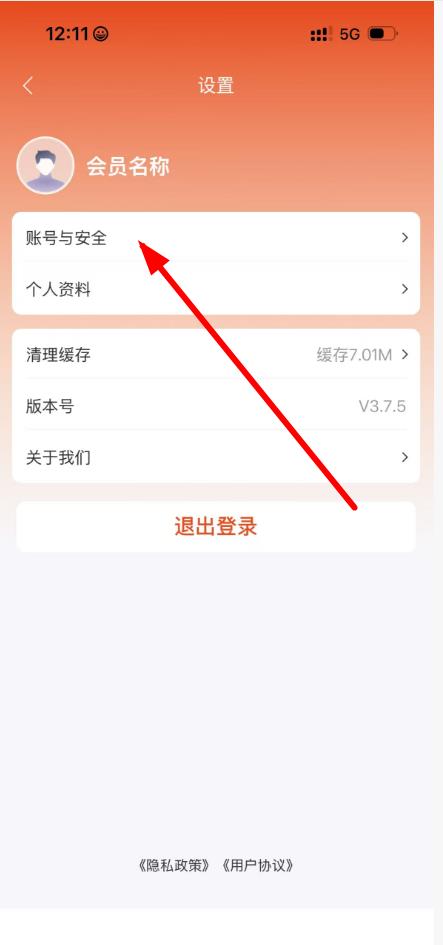 2、在我的頁面,點(diǎn)擊頭像右側(cè)的設(shè)置圖標(biāo),進(jìn)入設(shè)置界面,找到并點(diǎn)擊賬號(hào)與安全選項(xiàng)。