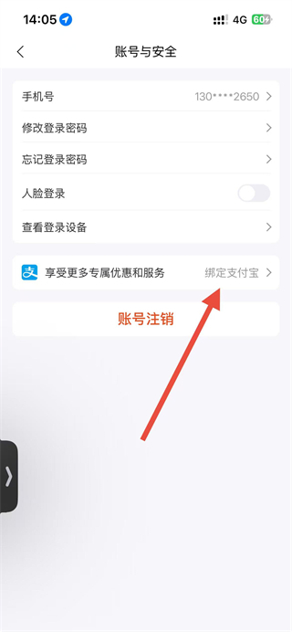 4、在賬號(hào)與安全頁面,點(diǎn)擊綁定支付寶選項(xiàng)完成綁定,后續(xù)支付時(shí)即可選擇支付寶方式完成交易。