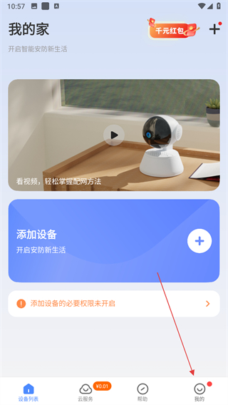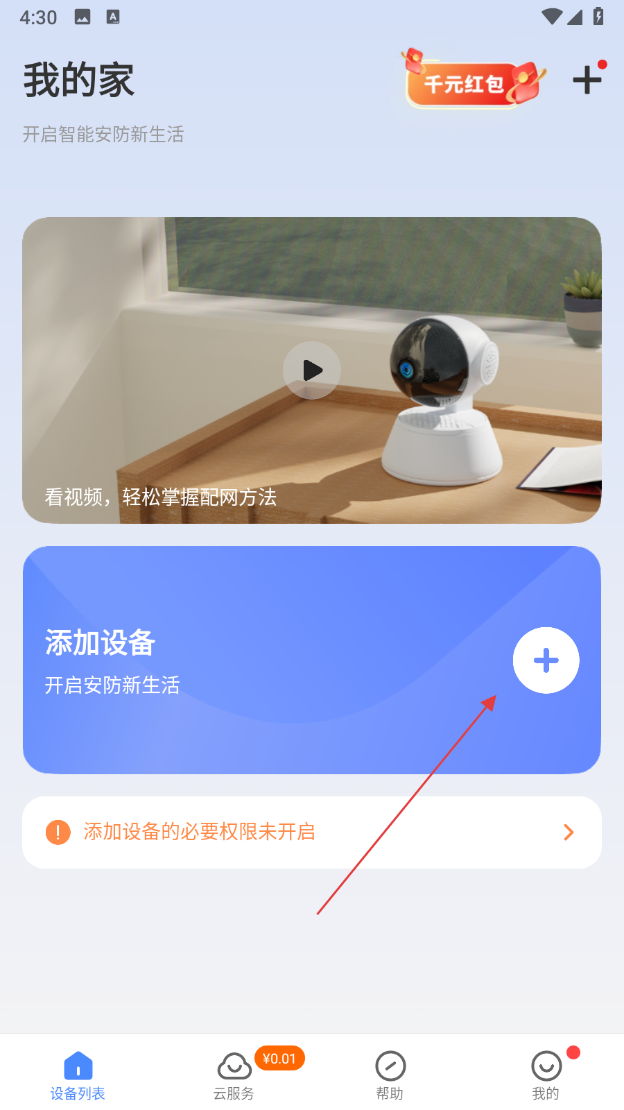 1、打開v380pro應用進入我的家界面,在界面中找到添加設備板塊,點擊其右側的+號按鈕。