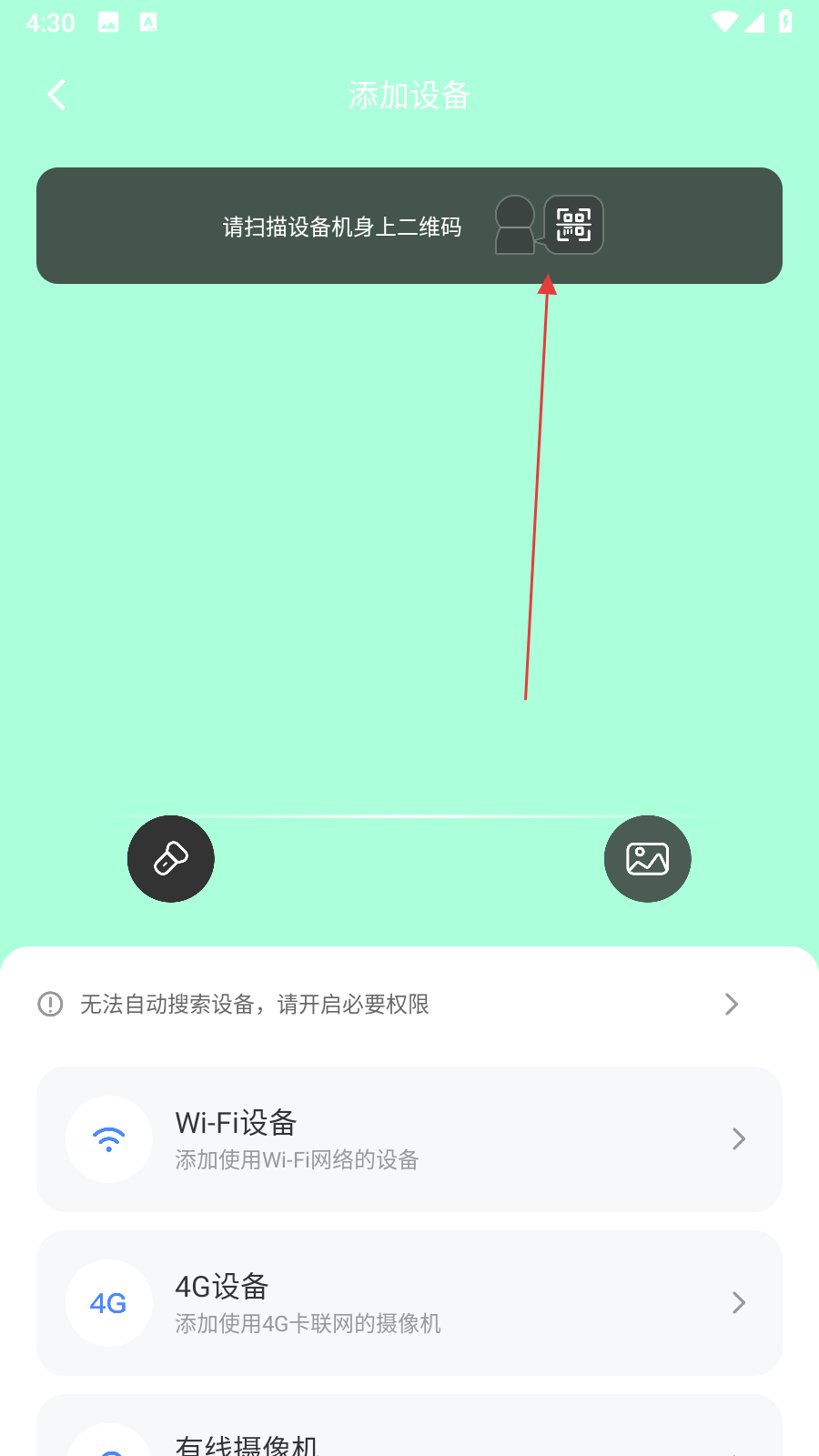 2、進入添加設備頁面后,若設備機身上有二維碼,使用手機攝像頭掃描設備上的二維碼來添加設備。