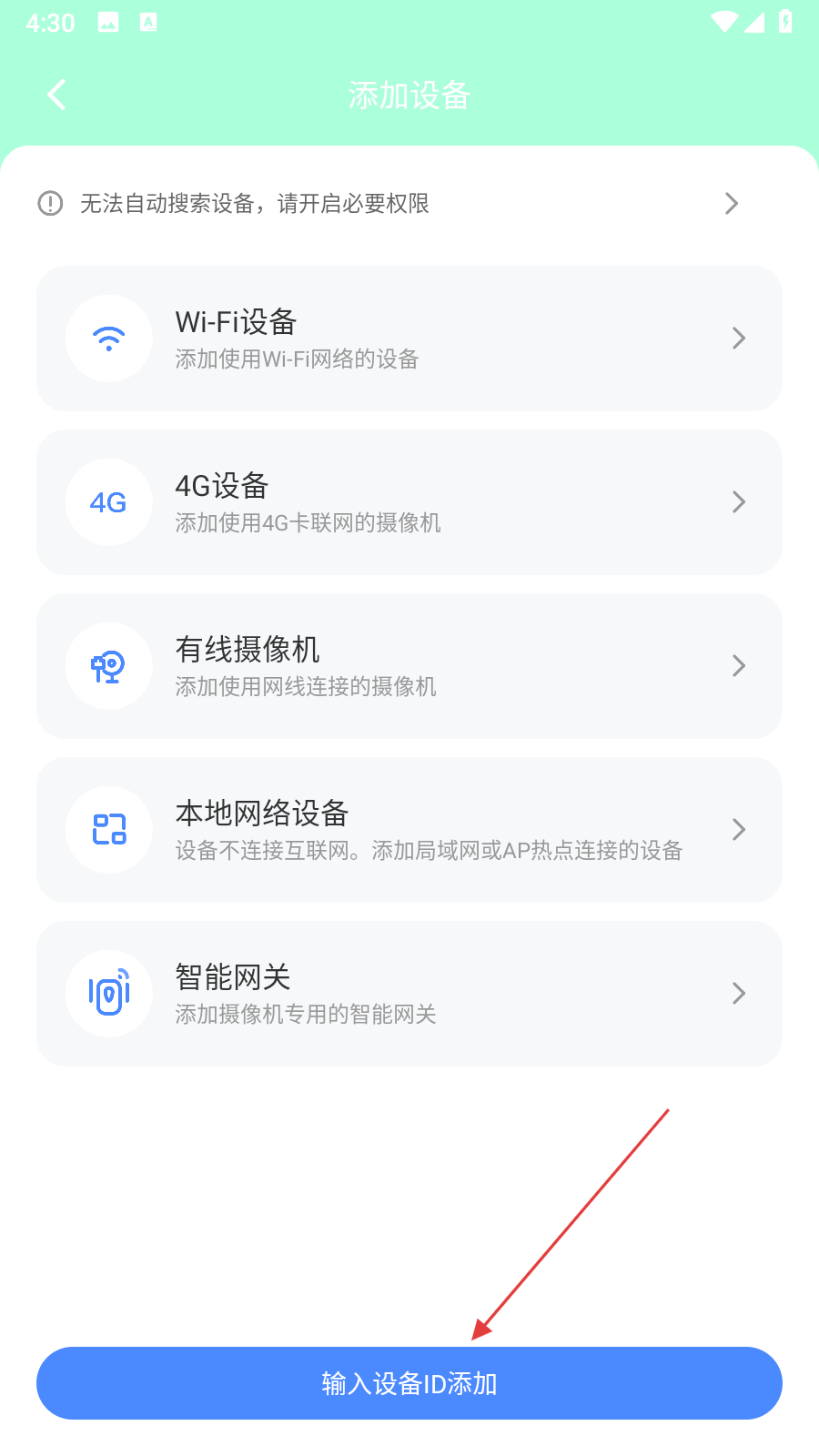3、若無法通過掃描二維碼添加,可在添加設備頁面下方,點擊頁面底部的輸入設備ID添加按鈕,在彈出的輸入框中準確輸入設備的ID號。