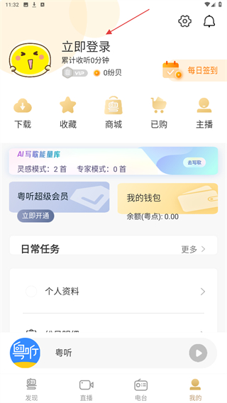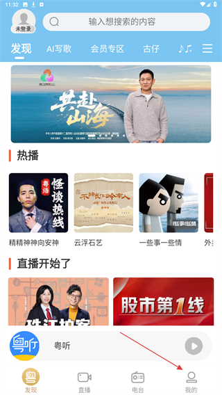 1、打開粵聽app,點(diǎn)擊底部導(dǎo)航欄中的直播選項(xiàng)。
