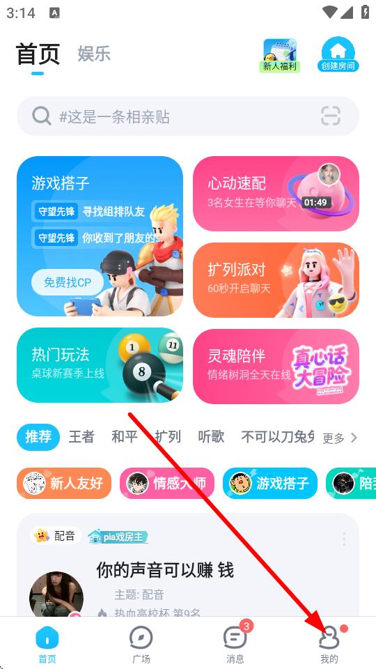 1、打開tt語(yǔ)音App進(jìn)入首頁(yè),點(diǎn)擊底部導(dǎo)航欄中我的選項(xiàng)進(jìn)入個(gè)人頁(yè)面。