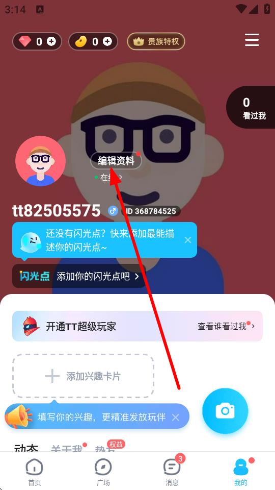 2、在個(gè)人頁(yè)面里,點(diǎn)擊頭像下方的編輯資料按鈕進(jìn)入個(gè)人資料編輯界面。