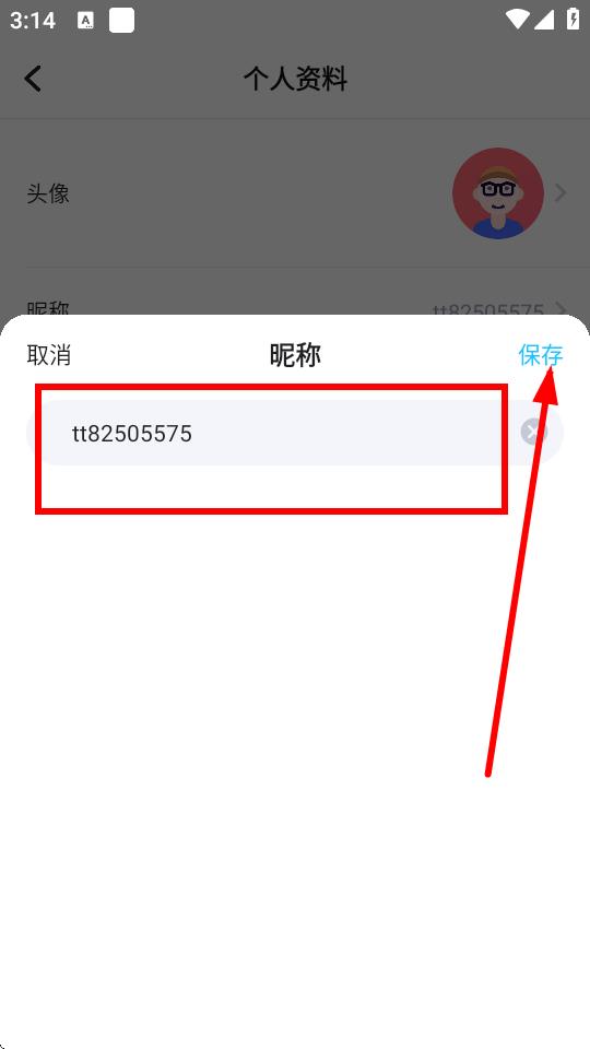 4、在昵稱修改界面,刪除原昵稱后輸入新昵稱,再點(diǎn)擊右上角保存按鈕即可完成修改。